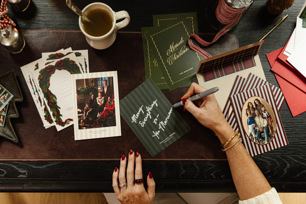 Julia describes the aesthetic as “moody-modern meets timeless,” with cool color palettes, metallic accents, and classic motifs. Her favorite design, Winter Drapes, offers a warm welcome with a heartfelt message on the front and a photo on the back—perfect for sharing a glimpse into your home and family.